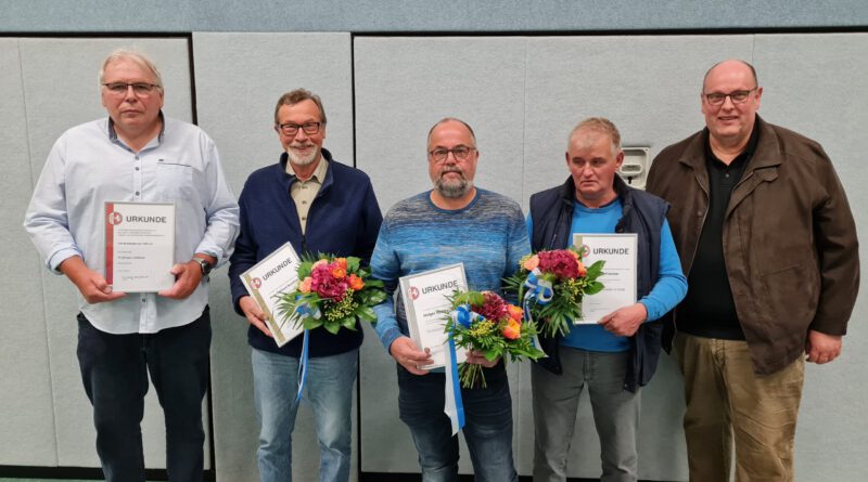 Auch der FLVW, vertreten durch den Kassierer Thomas Emmerich, hatte noch einige Urkunden für langjährige Vereinsarbeit mitgebracht. Hier erhielten u.a. Hans-Eckhard Buschmeier (Leichtathletik), Holger Radtke (Jugendarbeit) und Wolfgang Fröscher (Schiedsrichter und Vorstandsarbeit) die Glückwünsche ebenso übermittelt wie Dirk Hartwig stellvertretend für den gesamten TSV Kirchheide, der im vergangenen Jahr seinen 75. Geburtstag feiern wollte (was aber coronabedingt ausfallen musste)