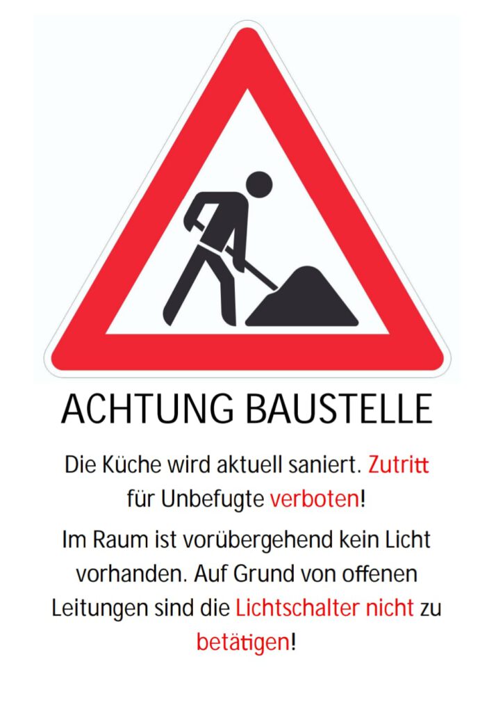 Während der Umbauphase ist der Küchenbereich aus Sicherheitsgründen gesperrt. Bitte beachtet die Hinweisschilder – der Zutritt ist für Unbefugte verboten. Aufgrund offener Leitungen dürfen die Lichtschalter im Raum nicht betätigt werden.